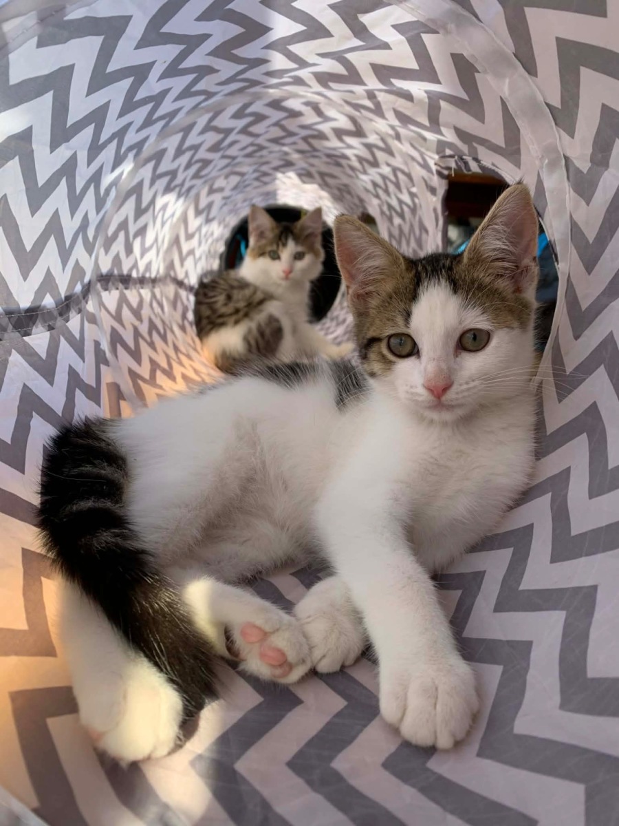 Stella and Shanti adore head and face rubs and find comfort in each other's company, sharing both their playtime and peaceful moments. Their favorite pastime is chasing after balls, and with such a close bond, they love sleeping side by side. Though they occasionally get anxious, these gentle natures can best thrive in a single or couple setting. They can certainly adapt to more lively households, provided they have the chance to retreat to quieter spaces when needed.
