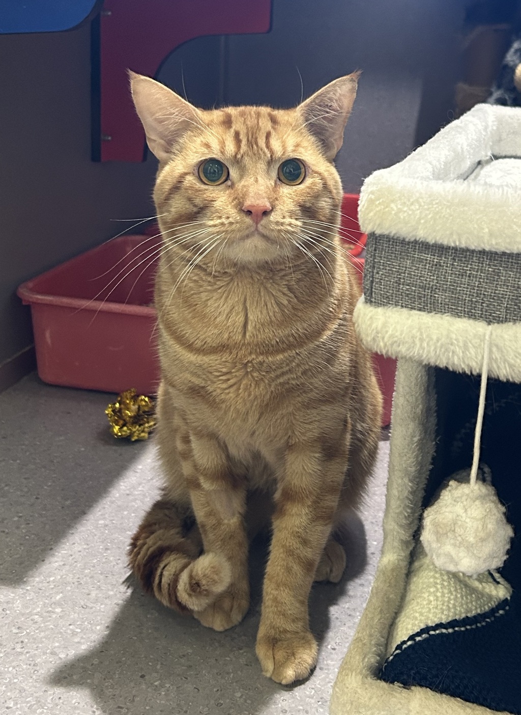 Hi I'm Jengo! I am a sweet but shy boy who is looking for a family that will be patient with me whilst my confidence grows. I enjoy my cozy hiding spots where I can receive head pats and chin scratches from the comfort of my bed. I often come out of hiding when other cats come by my pen, so I may like to be rehomed with a friend.