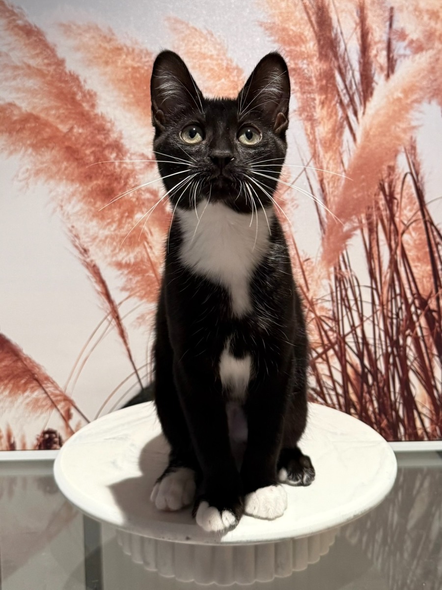Whiskers is an adorable tuxedo kitten with a big love for cuddles and companionship. She’s a true snuggle bunny who enjoys curling up on your chest, gently padding away while soaking up all the affection she can get.