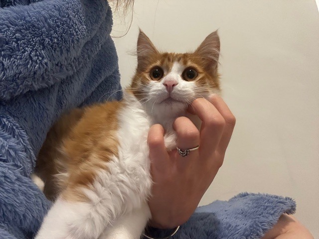 Oro draws a lot of confidence from feline company and would do best going to a home with at least one other cat — ideally his mum, June-bug, or brother, Billy. He can be adopted separately, but a familiar face would help him settle.