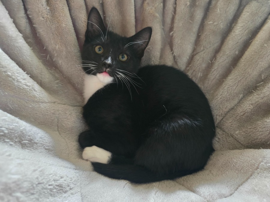 Flaggie has always been an adorable kitten, he has this little splash of white on his nose which helps tell him apart from his siblings. He likes to eat and when he had formula, he was always asking for more. Flaggie is toilet trained, loves his tunnel time and chasing the bugs at the windows.