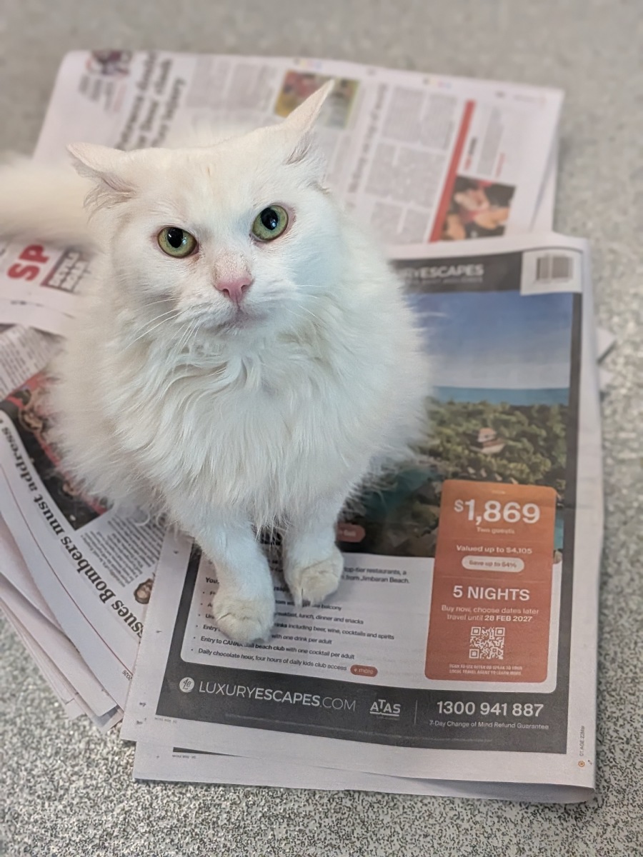 Billion is a floofy fabulous lady who would love a quieter home and a bright spot on the couch to snooze on! Billion does like to be the only feline in the household and does not want to share with a dog. She is a more quiet lady, but once she gets to know you she definitely enjoys affection. She also likes to have a chat around mealtimes! Because of her white coat, she will have to be indoors only and will need regularly brushing to keep her coat looking a billion bucks!