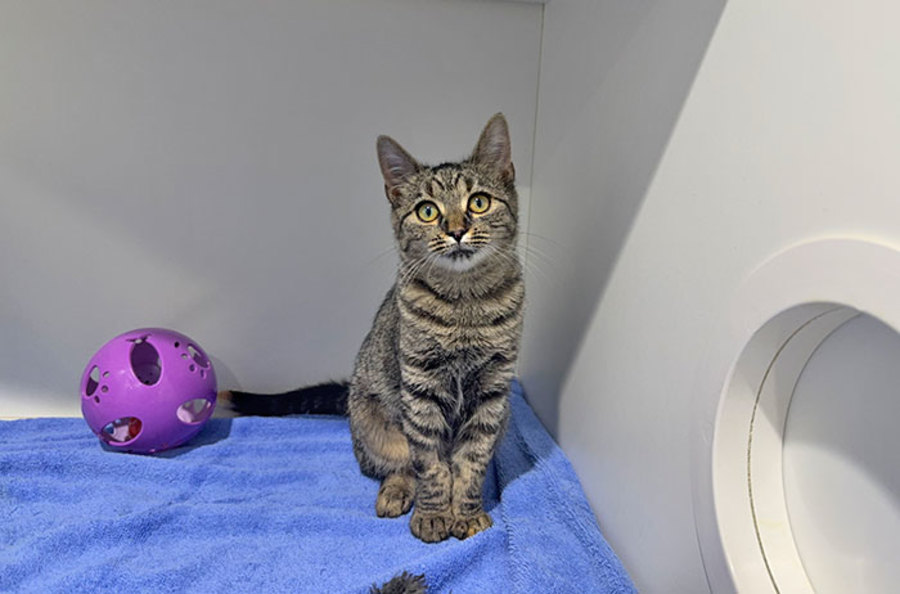 Hecate is a soft and sweet kitten who might seem a little shy at first, but don’t be fooled, she’s just saving her energy for play time! Once she’s ready, she’ll be darting after toys and exploring he surroundings with curiosity. Hecate purrs when picked up and enjoys being around people. She’s gentle, social, and always has a friendly, happy vibe.