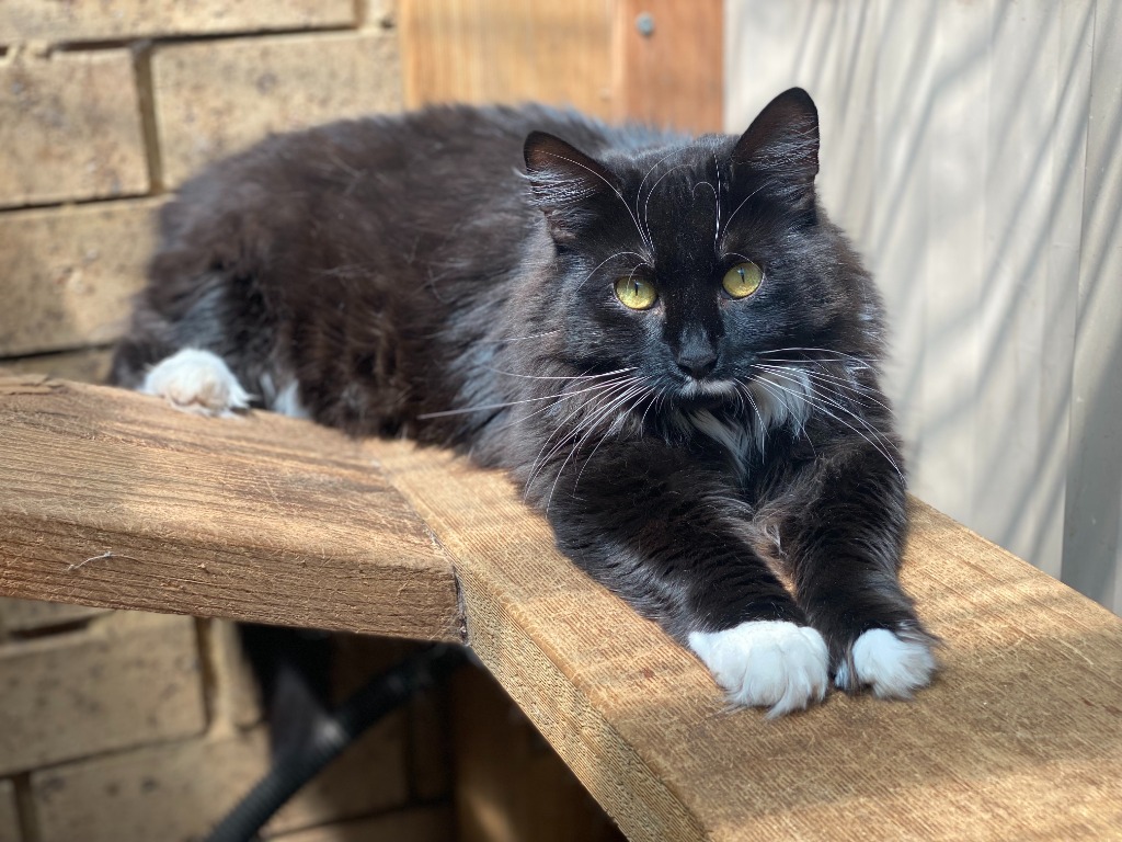 A beautiful domestic long hair with a soft, fluffy coat and the cutest little white “moustache,” Monica is as unique in appearance as she is in personality. She’s a chubby, gentle soul with a sensitive nature, carrying both her past and her resilience with quiet grace.