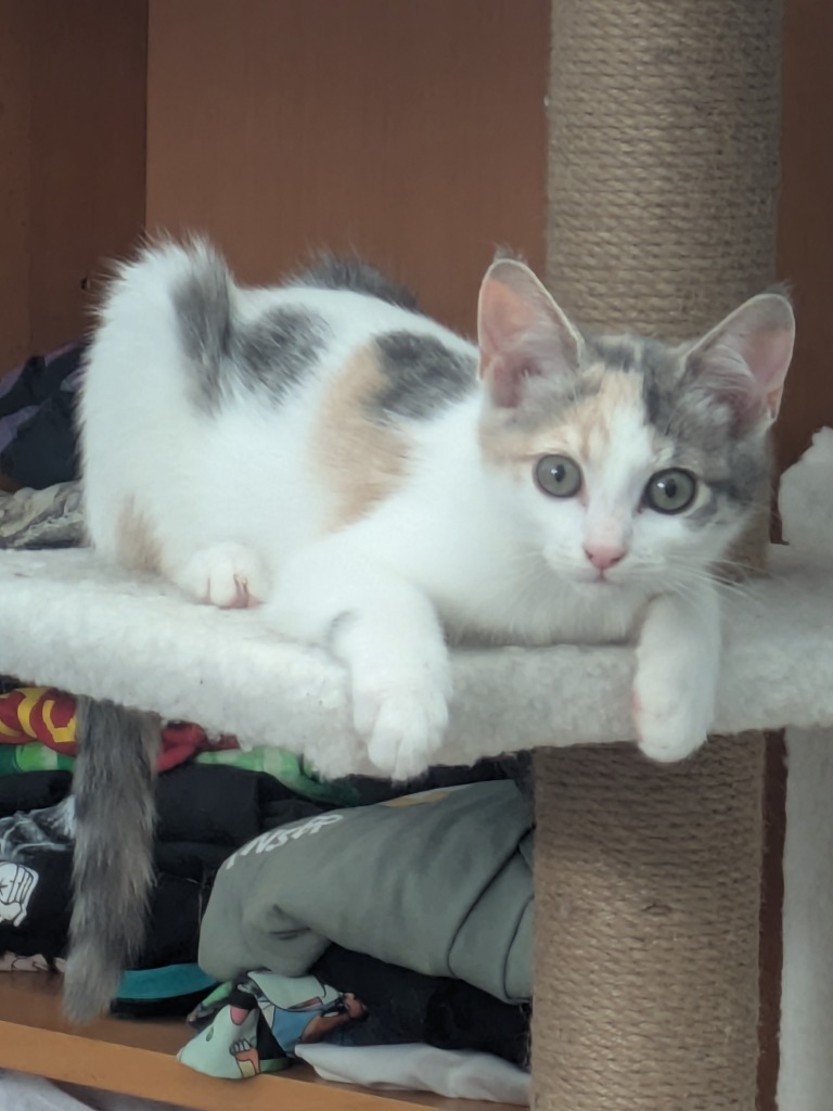 A striking little calico (white with tan and black patches), Bilby Moo is a nimble, agile domestic short hair with a playful spirit hiding behind her shy exterior. She’s fast, alert and mischievous, often zipping around with her siblings or entertaining herself with toys — especially fluffy balls and pipe cleaners, which she proudly chats to while she plays.