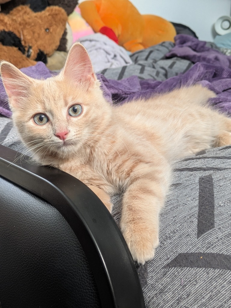 A gorgeous ginger boy with soft, fluffy medium-length fur and subtle stripes, Possum Moo is full of personality. He’s playful, chatty, goofy and endlessly entertaining — the kind of kitten who brings energy and laughter wherever he goes. He’s also incredibly food motivated, and it doesn’t take much for his love of snacks to override any initial hesitation!