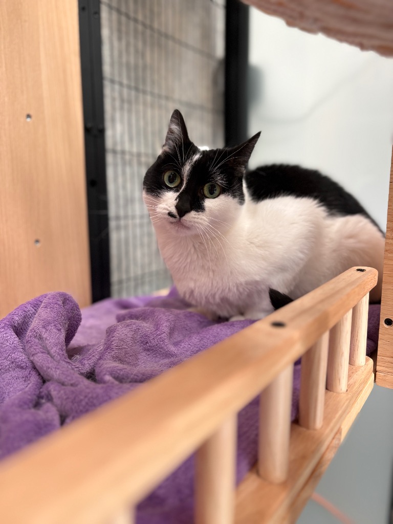 A sleek and elegant black and white domestic short hair, Sheba is the definition of affectionate. She is calm, gentle, and incredibly people-focused, with a “part-dog” personality that makes her stand out. If you’re looking for a cat who truly wants to be with you, Sheba is exactly that — she will happily follow you around, keep you company, and be involved in your day.