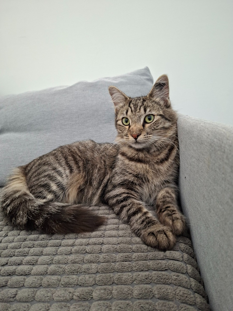 With his beautiful fluffy coat and those adorable oversized paws, Oil Prices is as stunning as he is affectionate. He is the kind of cat who just wants to be part of your everyday life, whether that is lounging beside you or curling up for a cuddle.