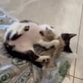 Lamington has grown from a skeletal tiny kitten into a lovely affectionate kitten that is fast, strong and obsessed with toys. She loves flying around the home playing with her wand toys panting from the exertion. She also loves the tiny mouse or ball toys that she can chase and carry in her mouth. She may be timid when meeting strangers at first. Once you gain her trust, she will lay on any body part in bed and she loves cuddling with you on the sofa.