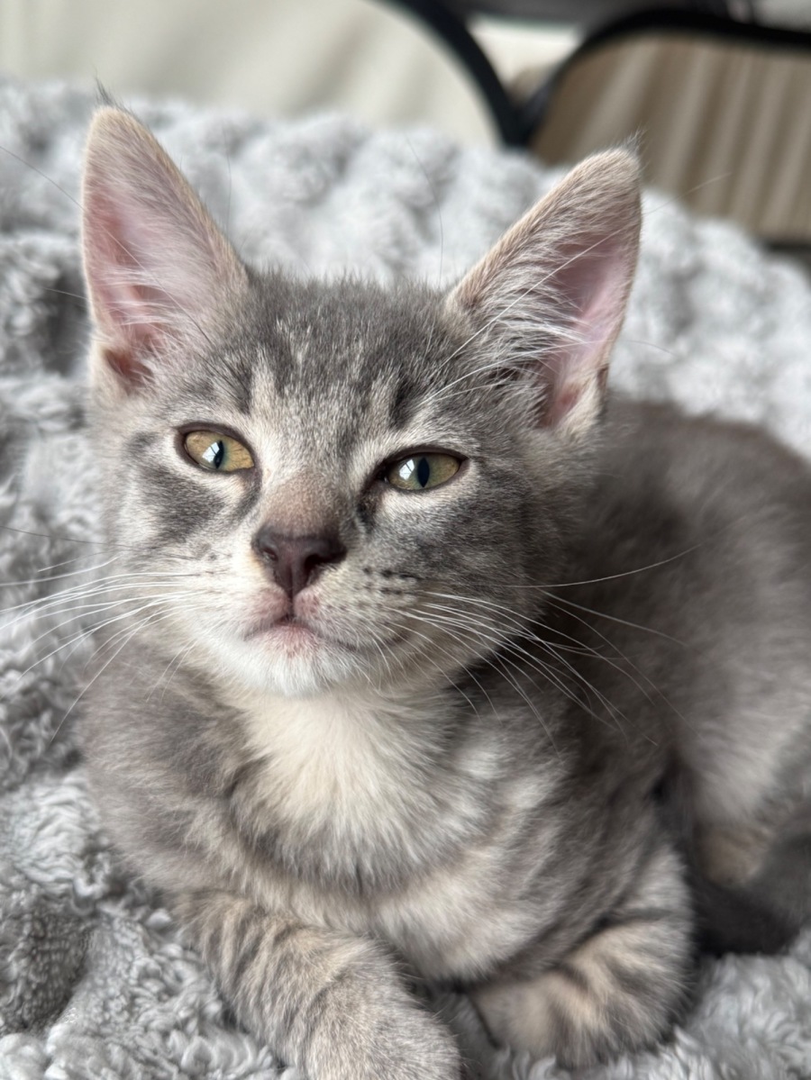 With his striking blue coat and dark grey nose, Spider is one handsome little fellow! Raised with his brother and sister in a caring foster home with a small dog, another cat and children, Spider is a cool, calm and collected character. He can also tear around the house with zoomies! He is clever and curious and loves to bump your nose with his sweet kisses. He deserves a home full of love and care and plenty of toys to scoot across the floor and carry around in his mouth and a cozy blanket or lap to curl up in.