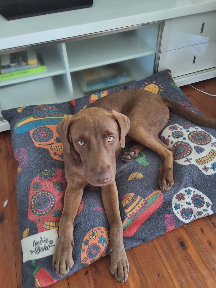At 10 months old, Kuma is a young, energetic boy still growing into himself, currently 22kg and likely to fill out into a beautiful medium–large dog. His unique look hints at a mix of breeds—perhaps Kelpie, Labrador, or even Weimaraner—but whatever he is, he’s 100% special.
