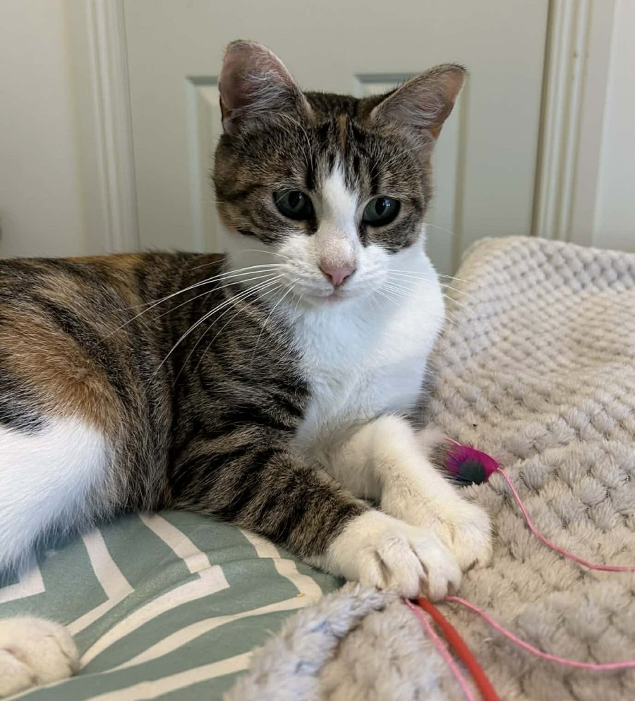 Lucy loves to be with you, loves sitting on your lap, or laying next to you on the bed. Sometimes she even makes it hard to breathe as she wants to lay right on your chest! Lucy has not been tested with other cats and dogs in her foster home, as she was busy with her babies, but she appeared curious and wanted to engage with the foster carers own animals. Lucy loves toys, and scratching boards and scratching posts.