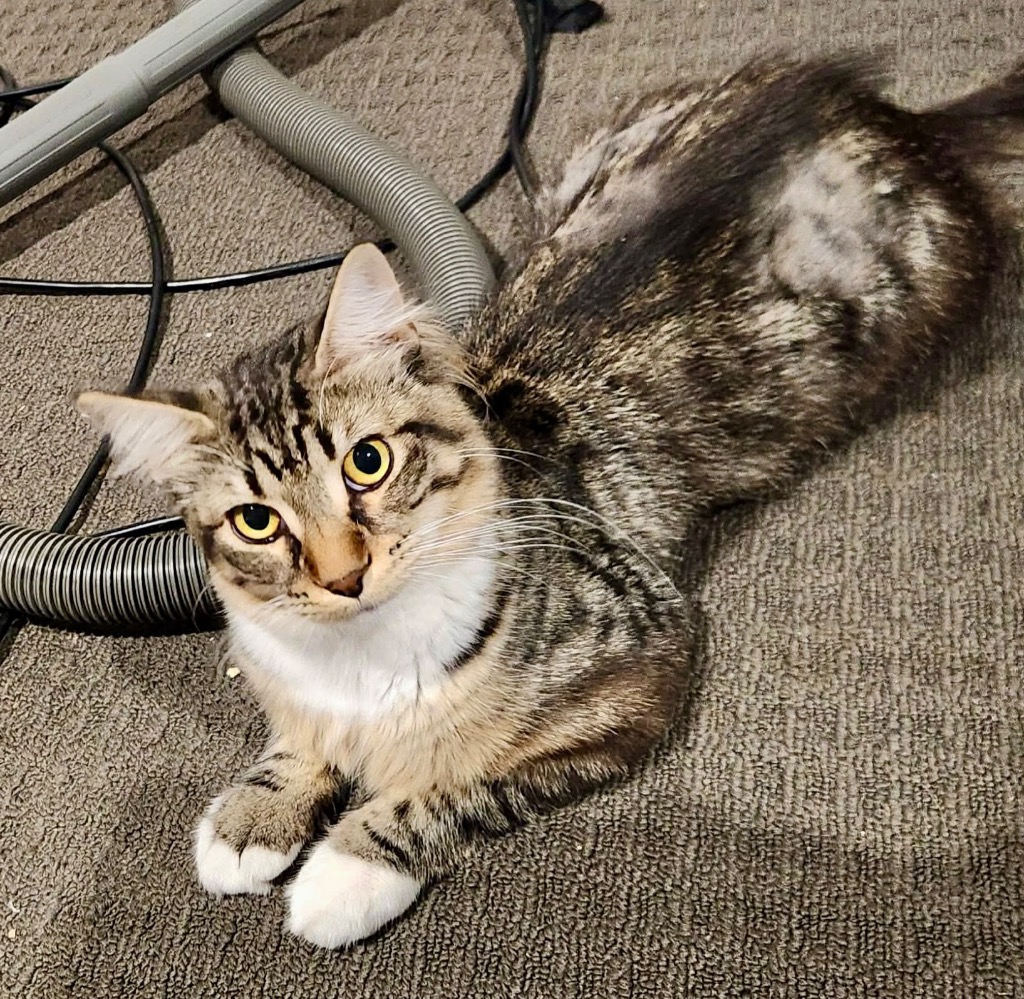 A striking long-haired silver and black tabby with a big fluffy tail, white chest and deep yellow eyes, Romeo is as handsome as he is expressive. He’s a chatty, observant boy who likes to “report” on everything happening around him — whether it’s someone at the door or a triumphant toy mouse catch, you’ll always be kept in the loop.
