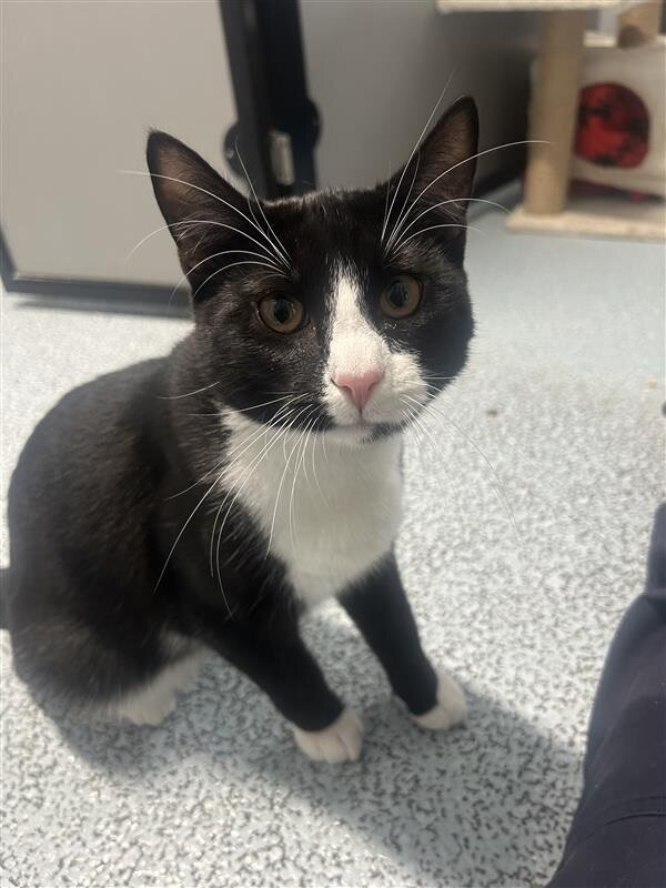 Hi there! I'm Smitty, a curious Domestic Short Hair kitten ready for my forever family. I'm a male, 6 months old, with an average energy level. I have a sleek coat, bright eyes, and a big appetite for exploring. I have no known child-related issues, so I could be a great fit for families with kids who are gentle and patient with new kitties. I love gentle play, cozy cuddles, and watching the world from a sunny window. I'm hoping for a calm, loving and quiet home where I can settle in, nap, and keep you company during your evenings. If you're looking for a friendly, adaptable companion who will grow with you, I'm your guy. Adopt me, and I’ll bring purrs, whisker kisses, and plenty of adventures into your life.