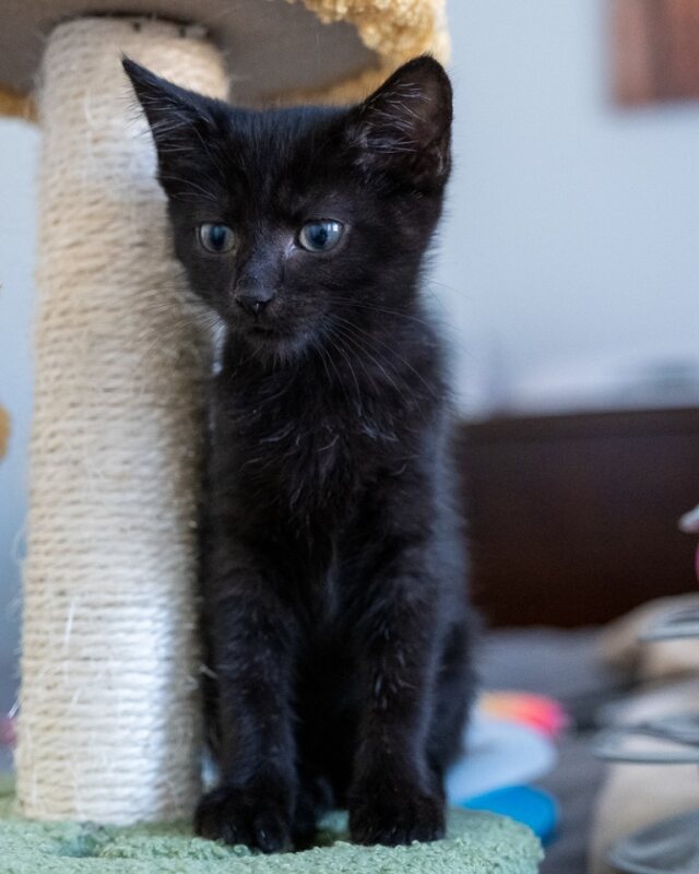 When it comes to playtime, Dumpling is all in. Her favourite dangling toy is her ultimate obsession and he will chase it with unrelenting energy, leaping, twisting, and sprinting like a tiny black tornado. There is no such thing as a quiet moment when the toy appears, but once the chaos ends, she will curl up nearby, proud of her acrobatics and ready to reward you with a contented purr.
