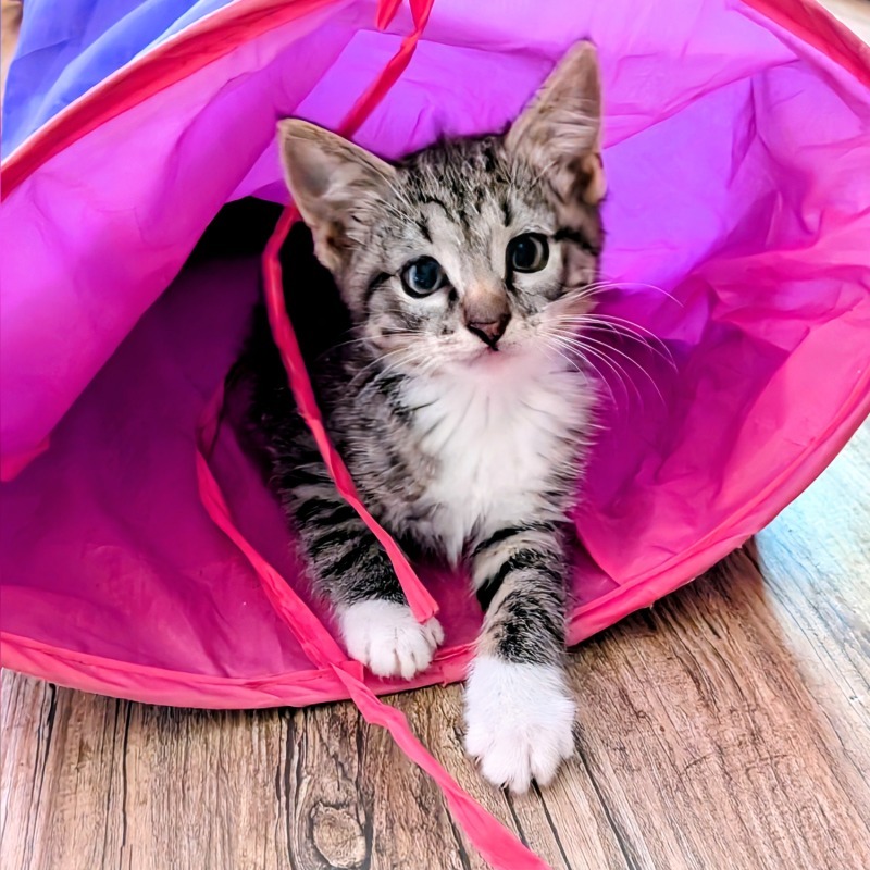Miley is a beautifully striped tabby girl with the sweetest soul. She loves weaving between your feet with her tail wrapped around your leg, or curling up on your shoulder to purr while nuzzling your ear. Shy at first, Miley quickly blossoms into a confident little explorer and has taken to life in a busy foster home — kids, cats, dogs, and even a SAFE foster puppy — all in her gentle stride.