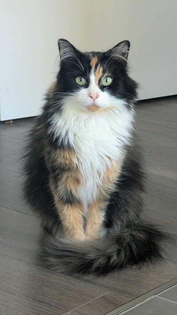 Playful at heart, Fig enjoys toys—especially anything string-like—but her favourite game is chasing (and being chased by) another cat. She’s confident and adapts well to new environments, though she may take a little time to warm up to unfamiliar people and might briefly hide when guests arrive.