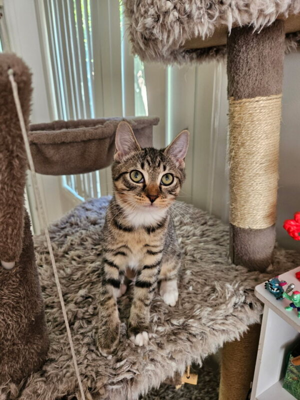 What truly sets Rocoto apart is her loving personality—she forms strong bonds quickly and shows her affection through soft purrs, gentle head nudges, and a constant desire to be near you. She would do well with first-time pet owners, families, or anyone looking for a loyal and comforting companion. With her balanced mix of playfulness and calm affection, Rocoto is the kind of kitten who brings warmth and joy into a home, making her a wonderful match for a wide range of adopters.