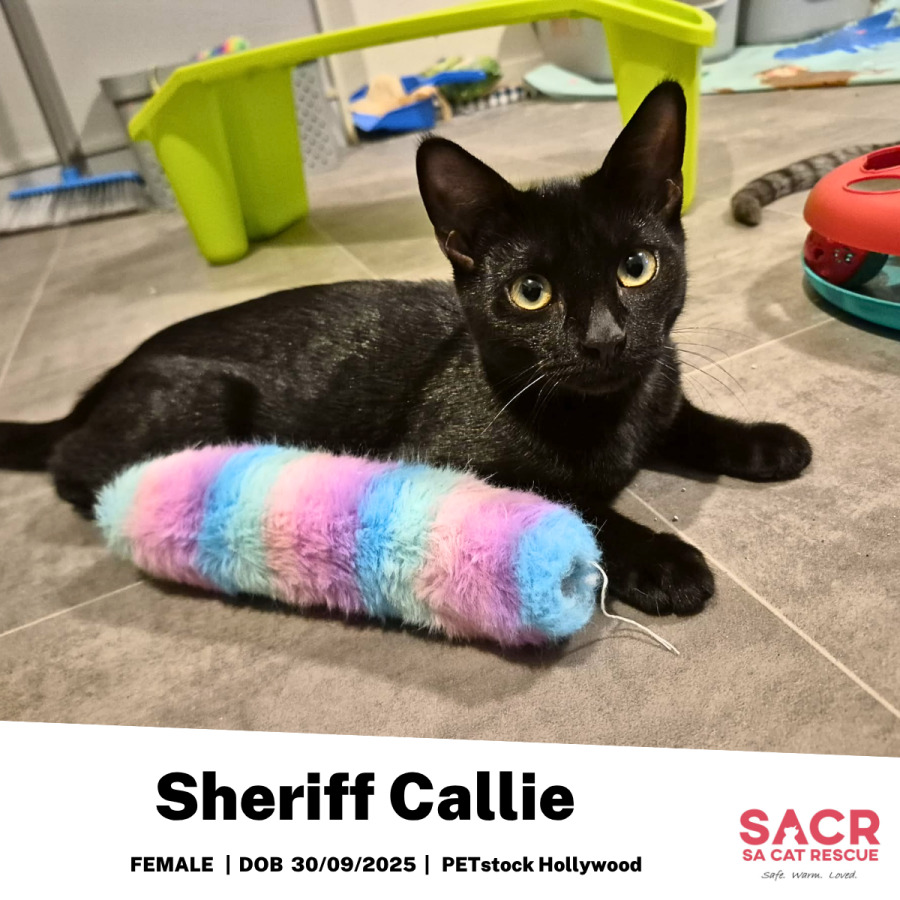 Sheriff Callie's adoption fee is $140 which includes desexing, microchipping, parasite prevention, and initial F3 vaccination.