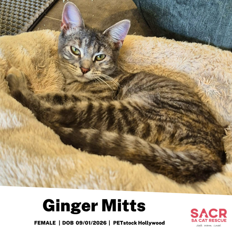 Ginger Mitts may look like a classic grey tabby at first glance, but a closer look reveals the sweetest little ginger touches on her paws and sprinkled through her coat. It’s just the beginning of what makes this girl so special.