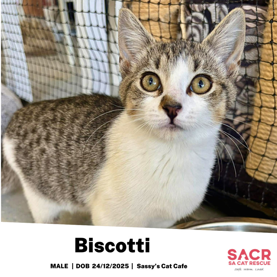 Biscotti's adoption fee is $195 which includes desexing, microchipping, parasite prevention, and initial F3 vaccination.
