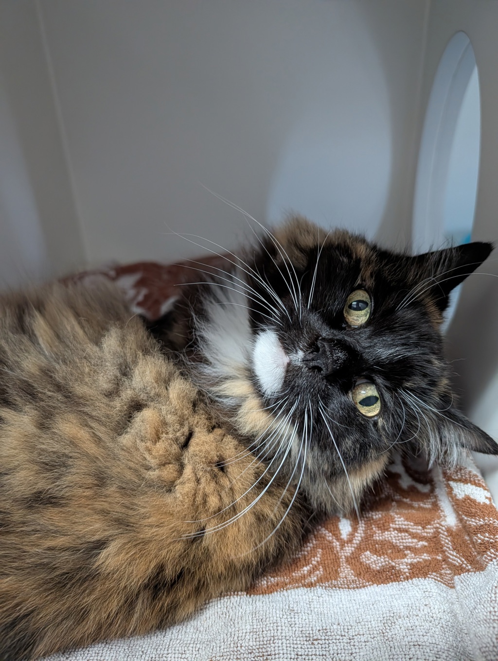 Meet Lola! She's a soft, sensitive, senior girl with a shy nature and a curious heart. Once she feels safe, her affectionate side blossoms, and she loves exploring her surroundings at her own gentle pace. Due to her shy nature, Lola will thrive in a calm, low-traffic home with cat-savvy adults only, who understand her need for choice and quiet reassurance. She will benefit from a safe room, cozy hiding spots, and a predictable routine to help her settle. She also enjoys targeting games and interactive play, and these are great ways to bond with her and help her to trust you.