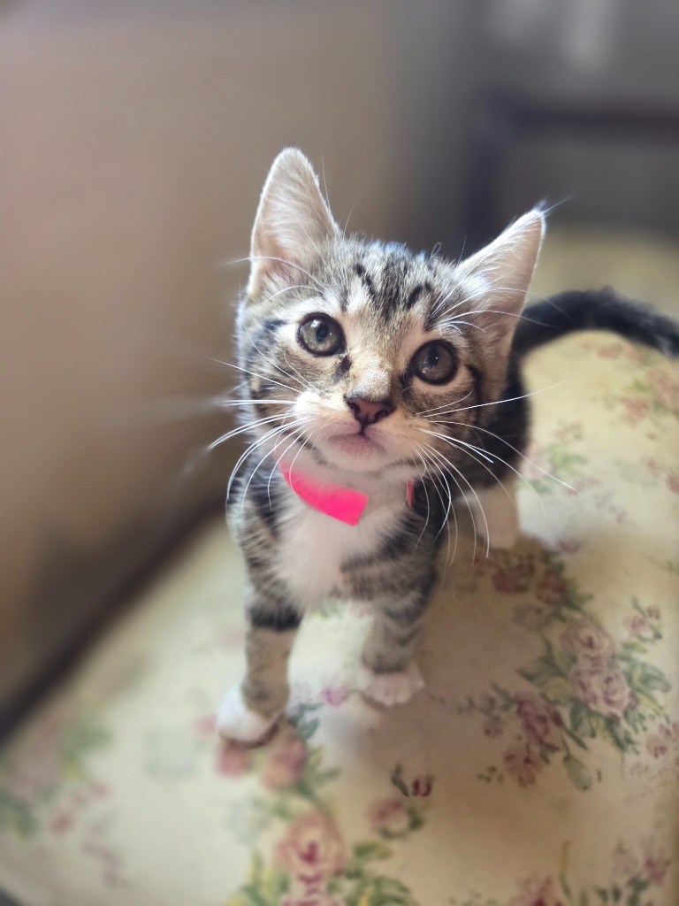 Donna is a confident, playful and cuddly kitten with a beautiful personality. She is great with all people, including children, and will confidently come and greet guests. Like most kittens her age, she is very energetic and loves playing, so would benefit from someone playing with her every day or another young playful cat/kitten.