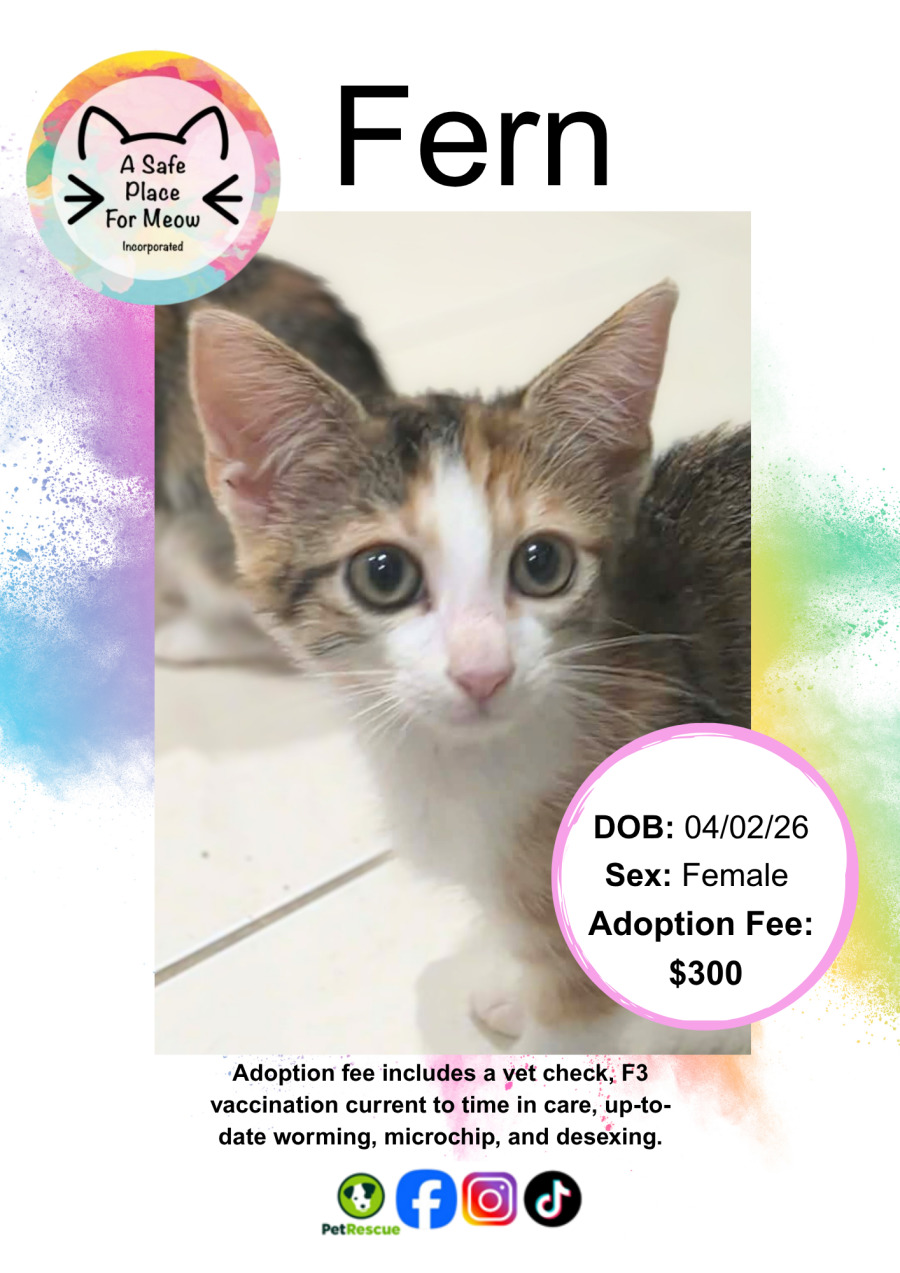 Our adoption fee helps us give every cat the best start in their new life. It covers their initial health check, microchip, desexing, F3 vaccinations current to time in care, and up-to-date worming.