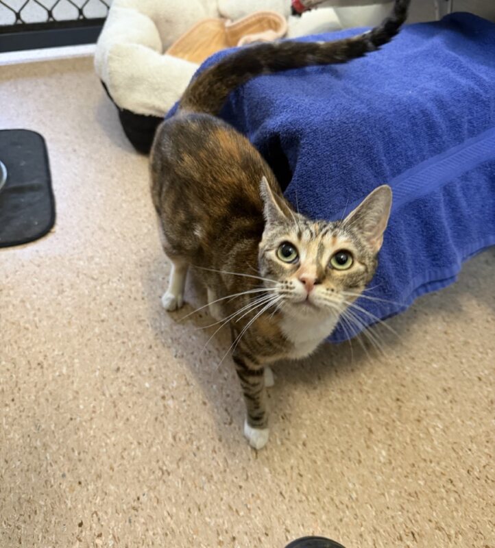 Hi, I’m Sook, a one-year-old domestic short hair tabby tortoiseshell. I can be a little timid and unsure at first, especially in new places, and I might seem a bit conflicted until I feel safe. But once I get comfortable, I’m a very affectionate and sweet girl.
