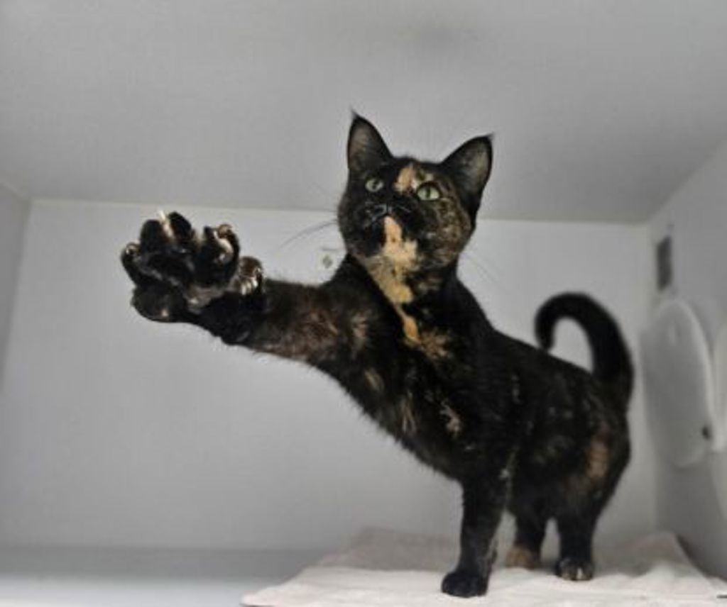 Fish Finger is a striking tortoiseshell girl with a big personality and an even bigger voice! Once a stray, she's now discovering just how nice life with humans can be-and she's got plenty to say about it! If you enjoy a chatty companion who will happily "talk" to you about her day, Fish Finger is your girl.