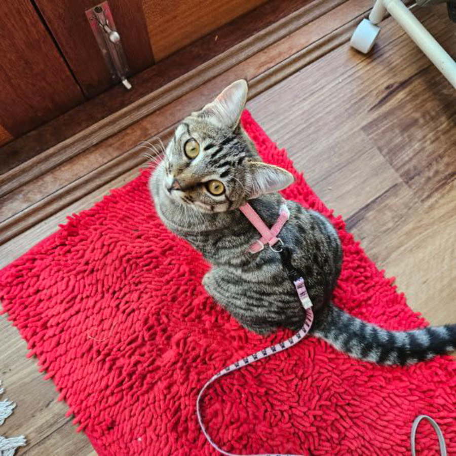 Little Moon is nearly six months old and still very much a kitten. She is very active, easily distracted and loves to play. She is desperate to investigate outside on her lead and curious indoors and out re anything & everything.