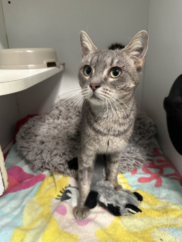 Cherry is a lovely silver tabby with a soft, affectionate personality and a real love for being around people. She is the kind of cat who happily leans into pats and settles in for cuddles, making her a wonderful fit for families with children or anyone wanting a hands-on, interactive pet. Being picked up and held does not bother her at all, and she handles it with an easygoing attitude that makes her especially approachable and gentle in everyday life.