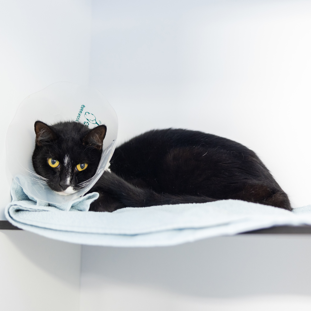 Underneath the cone is a soft, affectionate girl who enjoys calm company, cozy spots, and gentle pats. Once she's cone-free, she'll be back to her full, fabulous self - but she's already pretty perfect as is.