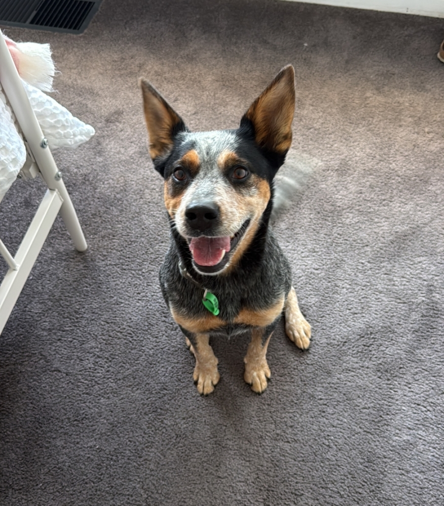 As a typical cattle dog, Nellie is intelligent and energetic. She gets along wonderfully with other dogs when off-lead and enjoys their company. On-lead, she can become a little anxious and vocal when passing other dogs, but this comes from excitement and uncertainty rather than aggression. With continued guidance and consistent training, she has great potential to improve in this area.