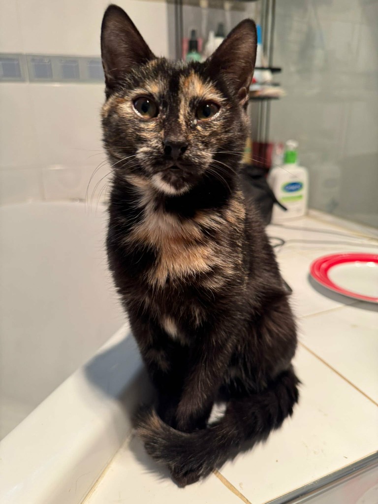 She has been exposed to other cats and dogs and integrated well. She doesn’t care about the 2 live in border collies or any other dog visitors and doesn’t care too much about other cats. She mostly plays with her brother, but will also sometimes try to play with other cats. She would love to be adopted with her brother, or to be with another friendly and playful cat