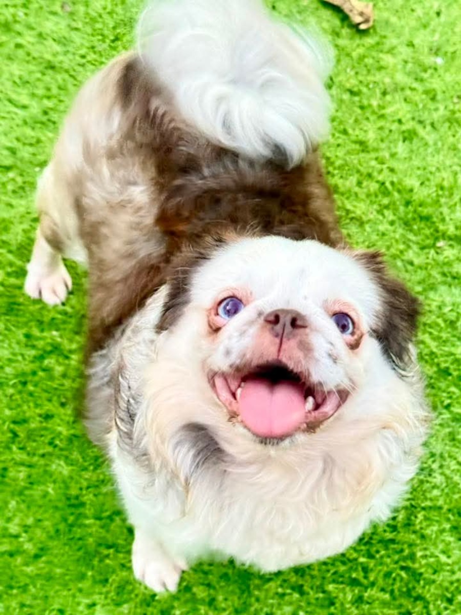 A chocolate and tan long-haired Pug girl, 2 years and 8 months old, with a big heart and an even bigger personality!
