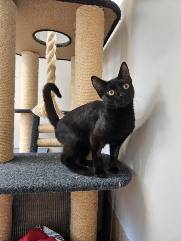 Hi, I'm Sage, a female Domestic Short Hair. I'm 6 months old. I'm a lively, curious girl who loves to chase toys, explore new spaces, and nap in sunny corners. My energy is high, especially with other kittens around, so I keep a busy, playful home hopping. I'm best with children aged 6 and up, who can match my pace and give me gentle affection. I thrive in a quiet, calm household where I can wind down after play and settle into a cozy routine. I adore feather wands, puzzles, and comfy window perches. I'm affectionate and curious, and I’ll reward your patience with plenty of purrs and wiggles of joy. I'm hoping for a peaceful home that balances fun and quiet moments. If you want a spirited, loving companion who grows with you, I might be the one for you. Please consider meeting me and starting an adoption journey!