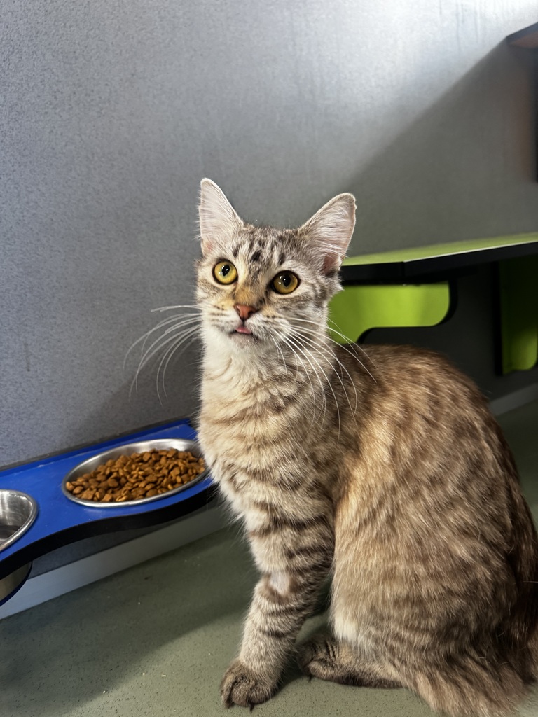 Hazel is an energetic and delightfully crazy 8‑month‑old kitten who is guaranteed to keep life exciting. Full of personality, this curious girl loves nothing more than zooming after her toys, exploring every nook and cranny, and showing off her playful antics. She's the kind of kitten who will have you laughing daily and wondering how so much fun can fit into such a small body.