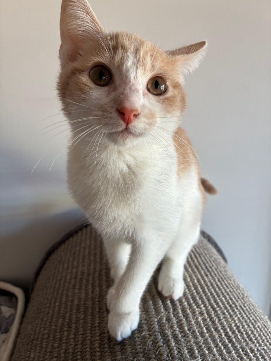 Aiden is a beautiful champagne (dilute ginger) and white tabby with the softest nature to match his gorgeous looks. He is an incredibly gentle and sweet boy who absolutely adores human affection. Calm, loving, and endlessly cuddly, Aiden is happiest when he’s in your arms, on your lap, or snuggled up close with someone he loves.