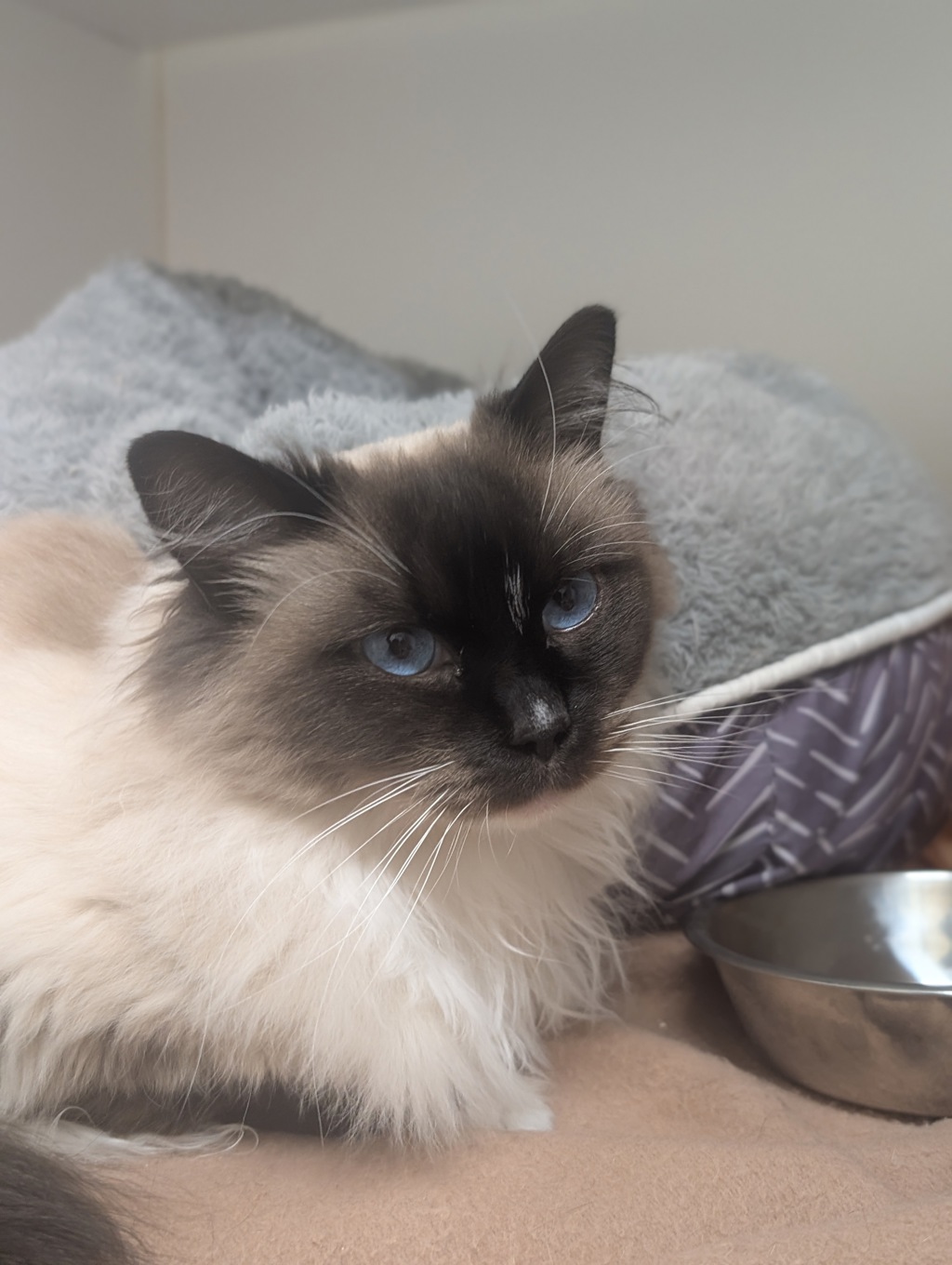 I'm a beautiful Ragdoll girl with the most piercing blue eyes-you'll notice them straight away. I also have a lovely, fluffy coat that will need regular brushing, but it just means more time we can spend together (I don't mind a gentle pamper once I feel safe).