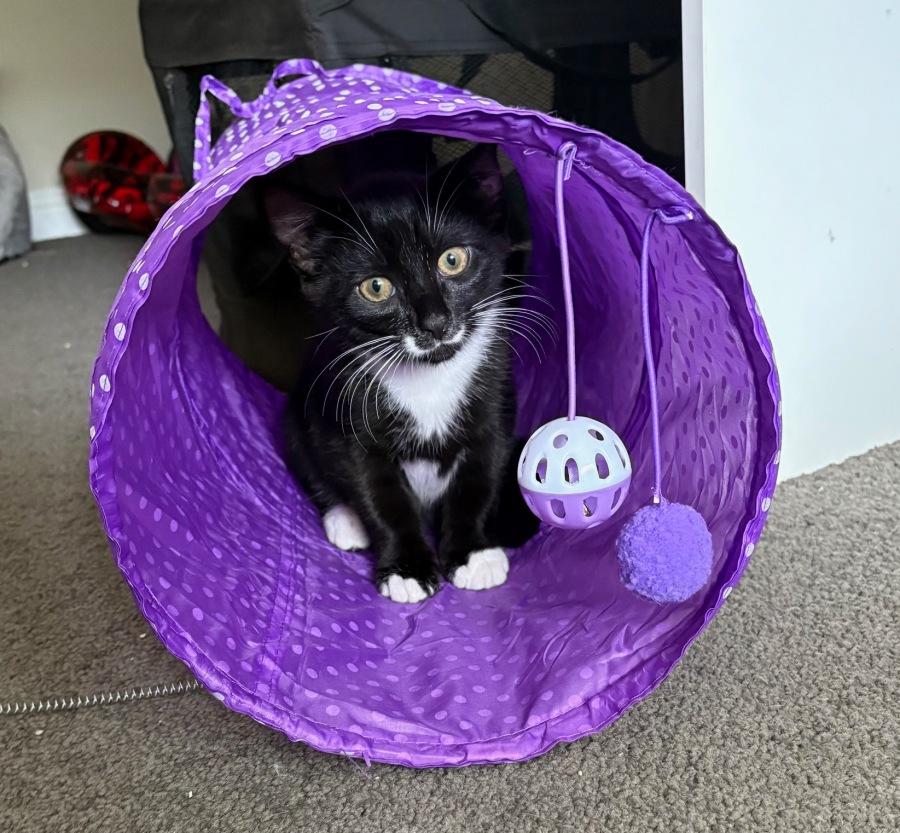 Socks is a kitten full of personality, fun and mischief. His favourite game is hide and seek and he loves exploring and wrestling with his siblings. Socks was likely born wild and has been in foster care since approximately five weeks old. He loves to be played with, and loves a pat, especially when he is napping. He is still warming up to cuddles but will tolerate them for short periods- he is simply too busy exploring and playing to sit still for too long!