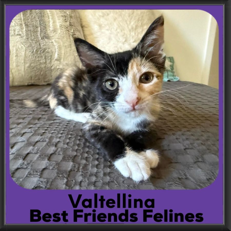 Valtellina (nickname Val) is a striking calico girl with a face split half ginger, half black and a sweet stripe down her nose. Her body carries a beautiful textured tortie-type pattern through her coat, with white feet completing the picture. Bottle-raised from two weeks old, she is sweet, confident and wonderfully comfortable with people.