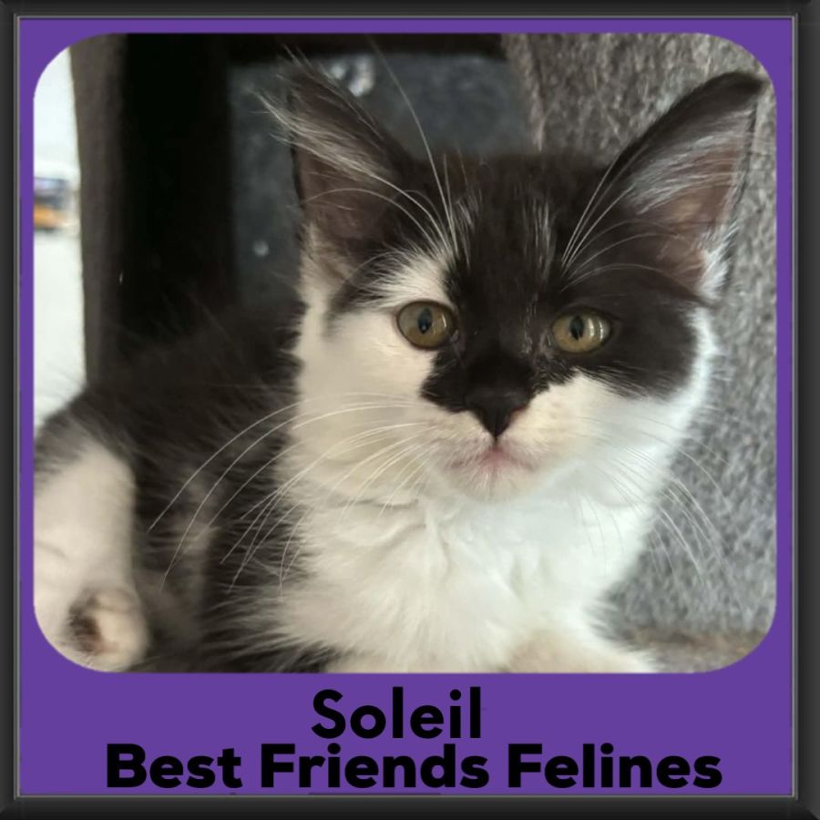 Soleil thrives with feline company and would be happiest in a home where she has another kitten or young cat to bond with — a dual adoption with her sister Manon would be a dream come true for her. She’s affectionate, playful, and full of sweetness, ready to bring warmth and gentle joy to her forever family.