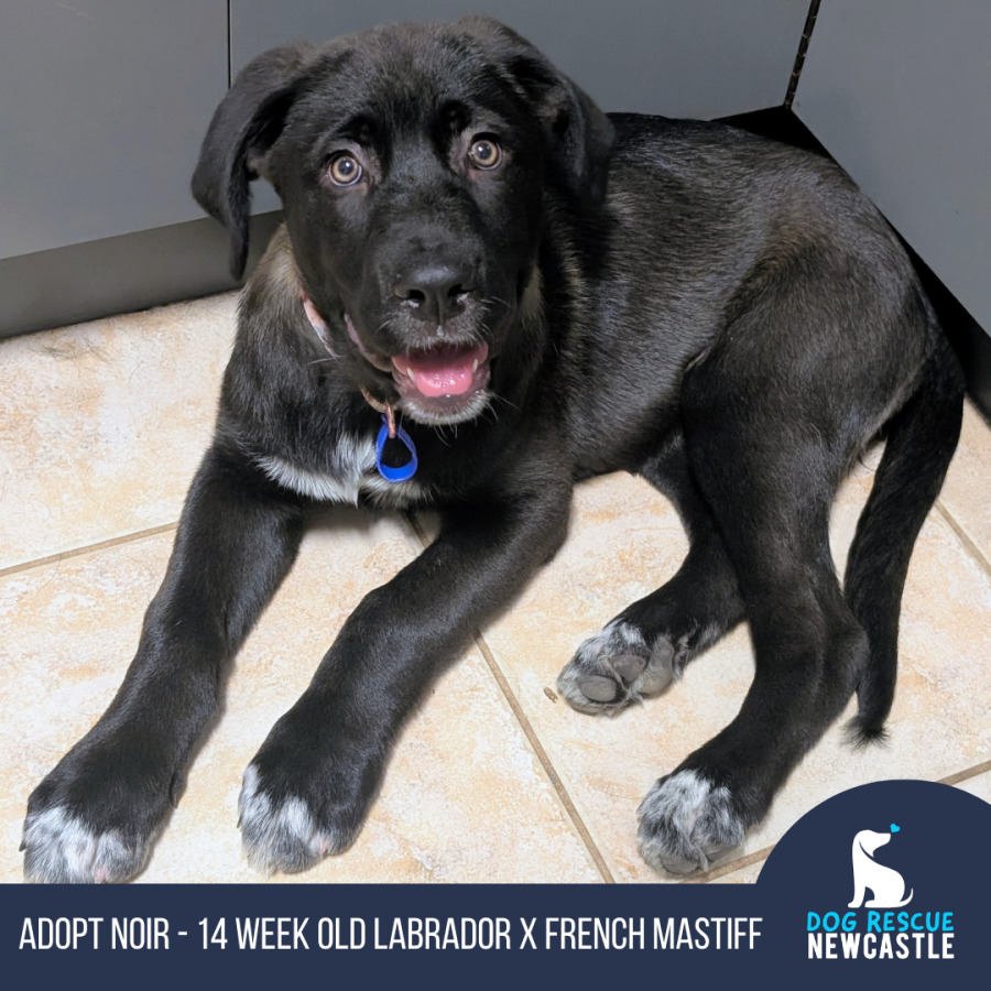 Noir’s parents were a French Mastiff / Labrador – German Shepherd mixed pairing, so she is expected to grow into an extra large dog. She is already quite a big puppy and may exceed 50kg as an adult. Her future family must be prepared for everything that comes with owning a large breed — including space, strength, time, and the cost of feeding a large dog.