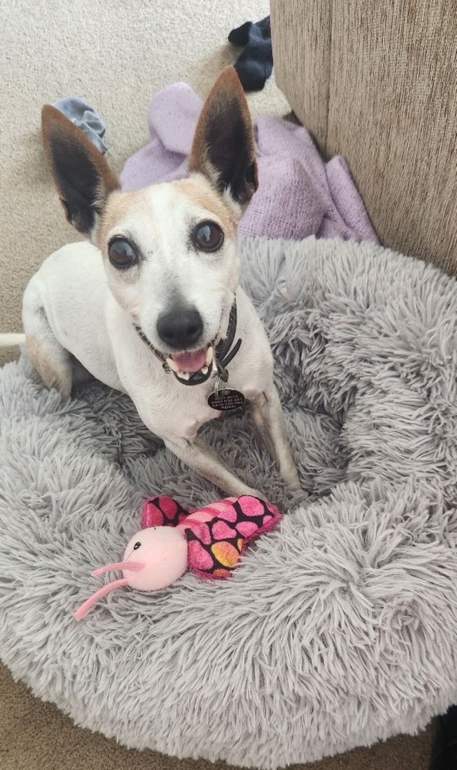 Lucy absolutely loves her walkies and will jump at any opportunity to get out and explore, staying true to her terrier spirit. She enjoys a good game of fetch and is always eager to show off her impressive hunting skills.