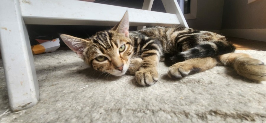 Noelle was found Christmas time 2025 with her sister on a farm property after being born in a rabbit burrow. Noelle is available to adopt alongside her sister Evie or separately to the right home that already has a friendly, young kitty for her to bond with.