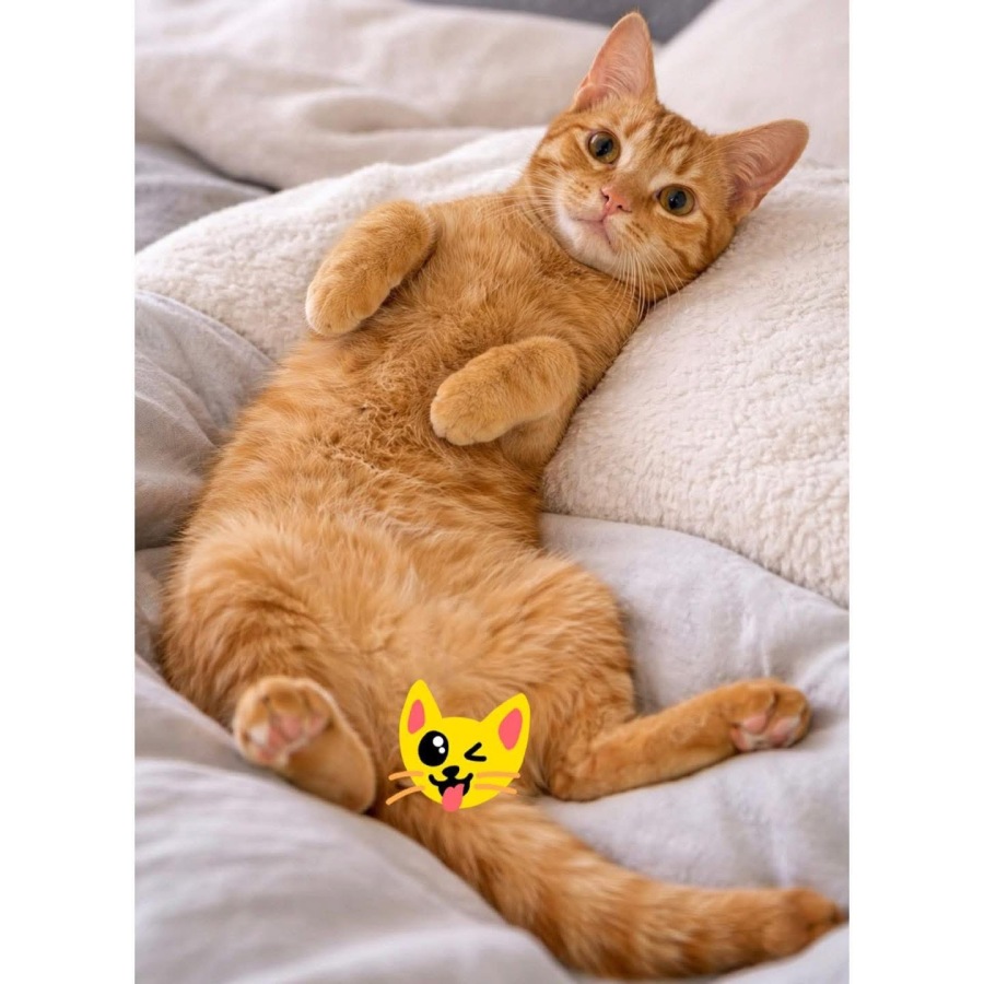 I am an absolute cuddle champion. I love pats so much that my purr practically never stops, vibrating like a little fizzy orange drink every time you give me attention. I’m smoochy, affectionate, and full of warmth, always ready to curl up next to you, drape myself across your lap, or nestle into your arms.