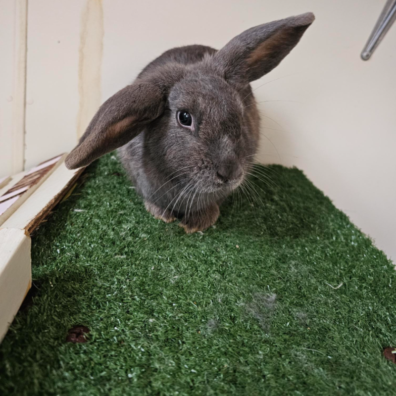 Pippin is a sweet little grey bunny with the most adorable wonky ears, giving her a charming, slightly quirky look that goes alongside her gentle personality. She has a calm and thoughtful nature, preferring to take her time getting to know people. When approached slowly and with respect, she’s more than happy to accept a soft, gentle pat. Pippin enjoys feeling safe and in control of her surroundings, and once she’s comfortable, her quiet affection and relaxed presence really shine through.