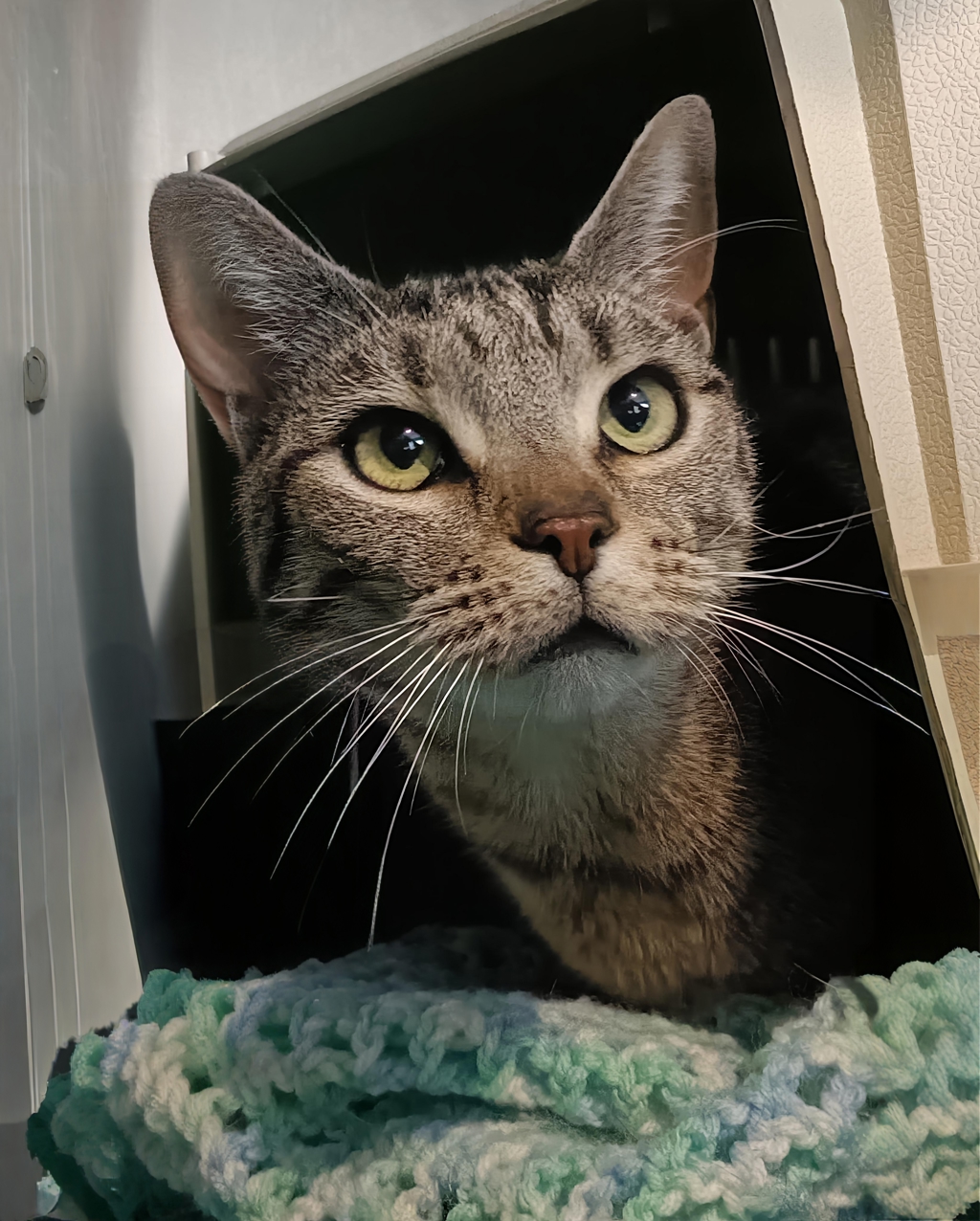This pretty tabby girl is the picture of calm and contentment. She's a gentle, settled soul who loves nothing more than curling up in a soft, comfy bed and watching the world go by between long, peaceful snoozes. When she's awake, she absolutely adores pats and affection-so much so that she gets a little too happy and gives the sweetest contentment drools when she's being loved on.