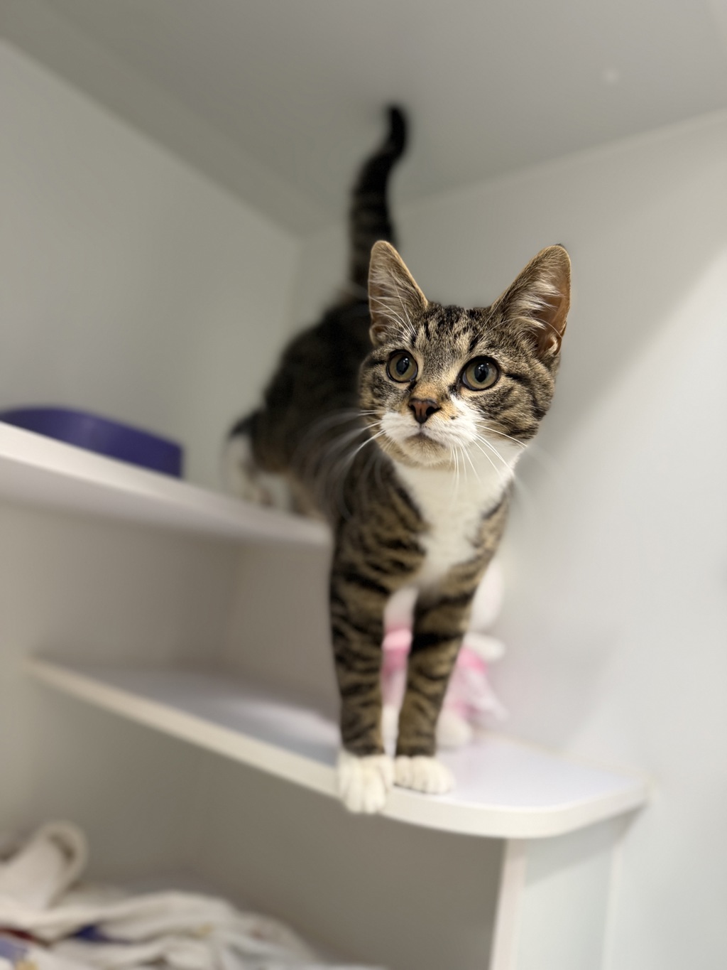 At just 6 months old, this tabby tornado is bursting with energy, curiosity, and cheeky charm. Ollie-Bob is confident, playful, and always on the hunt for his next great adventure. Toys? Fun. Climbing towers? Excellent. His humans? Even better. Sit on the floor and you'll quickly become his personal jungle gym, as he scales you like a tiny mountaineer before perching on your shoulders for cuddles and nose kisses.